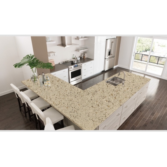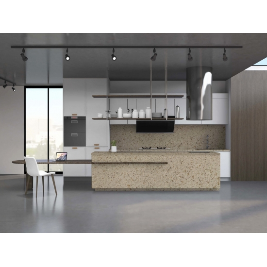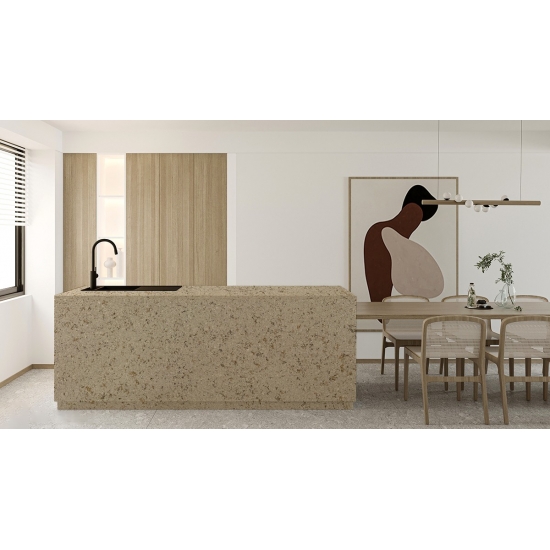 Sparkle Quartz Sand Leaf è una pietra di quarzo artificiale appositamente trattata che si differenzia dalle altre serie per il suo aspetto più scintillante. Questi quarzi conferiscono un senso di profondità e consistenza quando installati su pareti, pavimenti, piani di lavoro, ecc. Possono essere utilizzati per creare splendidi elementi murali e paraschizzi per lavabi in bagni e cucine. Questi quarzi sono estremamente adatti alle aree a contatto con l'umidità grazie alle loro proprietà antibatteriche e resistenti all'umidità.