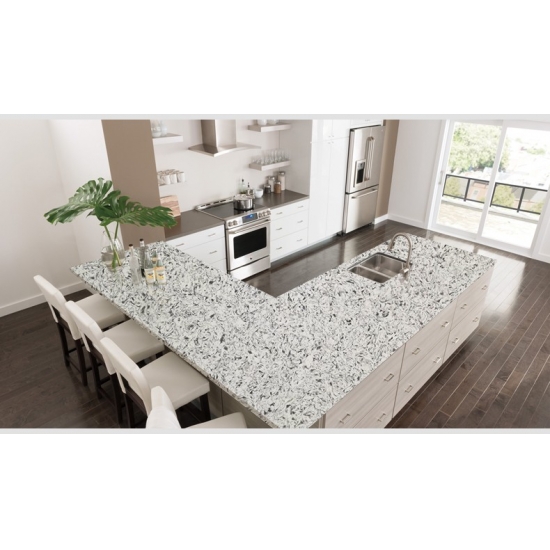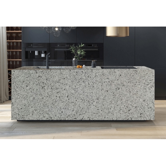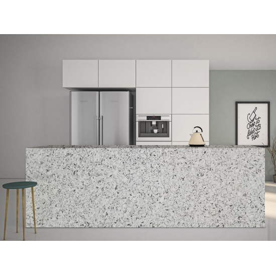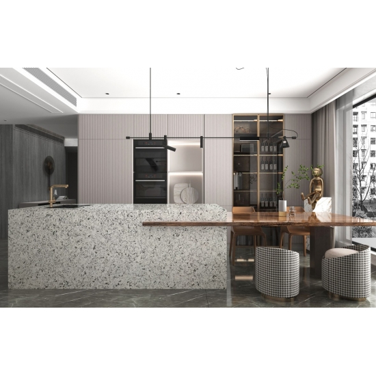 Wing Soar Dark Sparkle Quartz è una pietra di quarzo artificiale appositamente trattata che si differenzia dalle altre serie per il suo aspetto più scintillante. Questi quarzi conferiscono un senso di profondità e consistenza quando installati su pareti, pavimenti, piani di lavoro, ecc. Possono essere utilizzati per creare splendidi elementi murali e paraschizzi per lavabi in bagni e cucine. Questi quarzi sono estremamente adatti alle aree a contatto con l'umidità grazie alle loro proprietà antibatteriche e resistenti all'umidità.