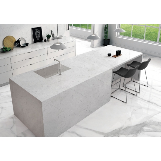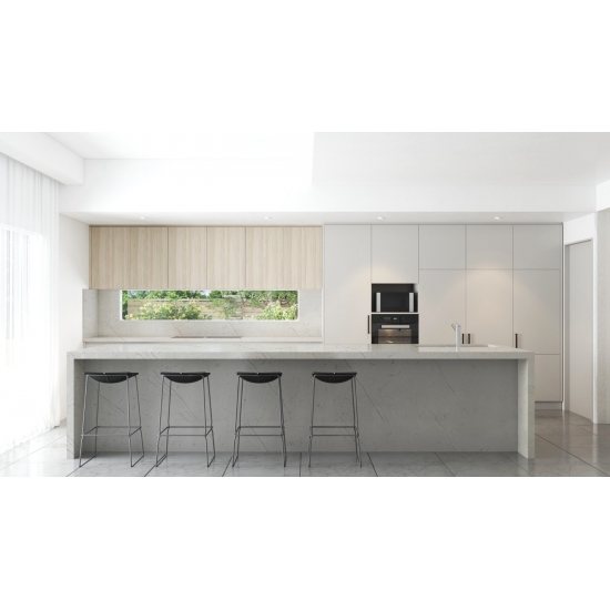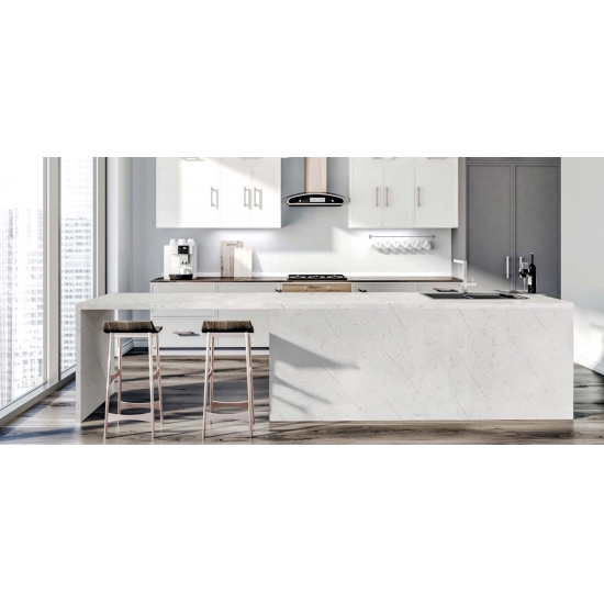 4005 Lastra di quarzo in marmo Bianca Veno Presenta un'estetica raffinata ed elegante, caratterizzata da un morbido sfondo bianco impreziosito da delicate e fluide venature grigie. I delicati motivi ispirati al marmo creano un senso di movimento e armonia naturale, conferendo alla superficie un fascino pulito ma lussuoso. Questo quarzo emana una raffinatezza senza tempo, bilanciando semplicità e carattere, ed è ideale per valorizzare interni sia moderni che classici con una finitura luminosa, elegante e raffinata.