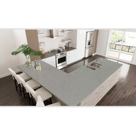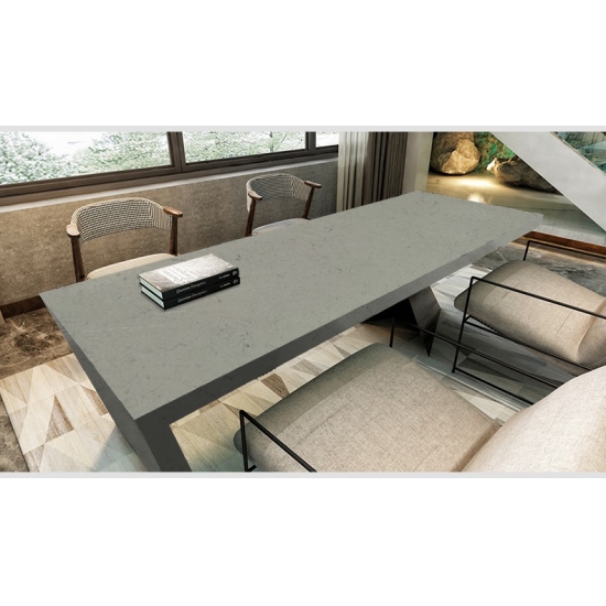 4028 Bianco Romano Marble Quartz Presenta un aspetto raffinato ed elegante, con un delicato sfondo bianco impreziosito da delicate e fluide venature grigie. La superficie emana una raffinatezza senza tempo, poiché il sottile contrasto tra la base bianca e le delicate venature crea un senso di profondità e movimento naturale. Questa lastra di quarzo è progettata per conferire un tocco sereno e lussuoso a qualsiasi spazio, valorizzando piani di lavoro, vanità o pareti con sobria eleganza.