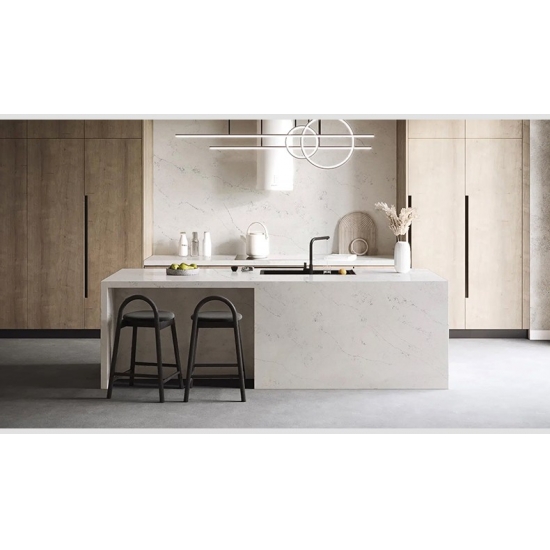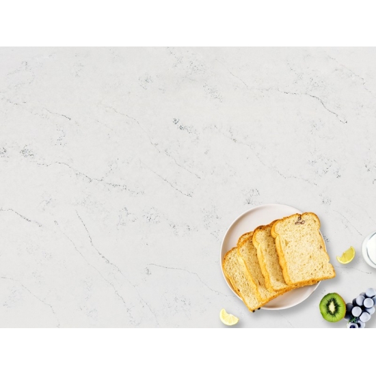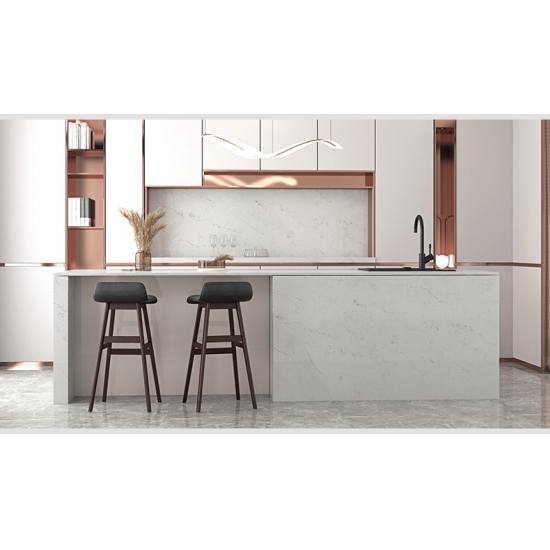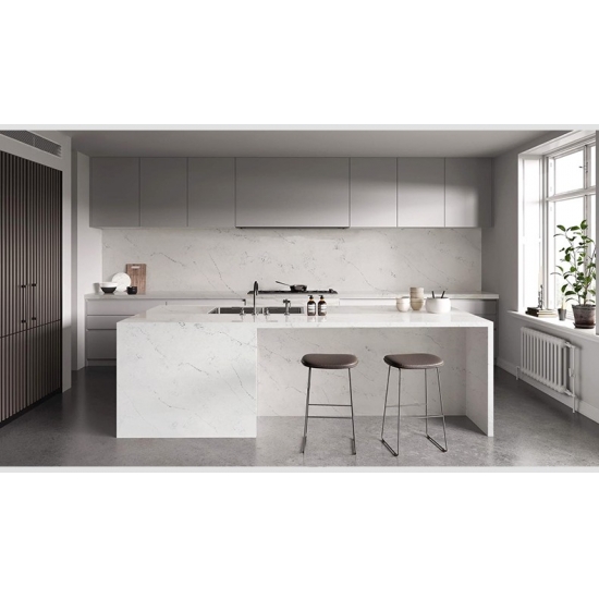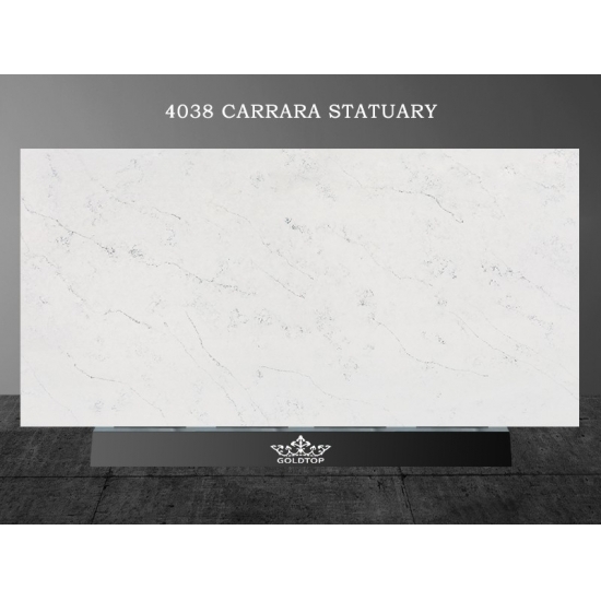 4038 Marmo Statuario di Carrara Quarzo Presenta un aspetto raffinato ed elegante, con un delicato sfondo bianco impreziosito da eleganti venature grigie ispirate al marmo Statuario naturale. La superficie emana una raffinatezza senza tempo, mentre le delicate venature scorrono naturalmente sulla lastra, creando un senso di movimento e profondità. Questo quarzo è progettato per conferire un tocco luminoso e lussuoso a qualsiasi spazio, rendendolo la scelta ideale per cucine, bagni e interni residenziali o commerciali di lusso.