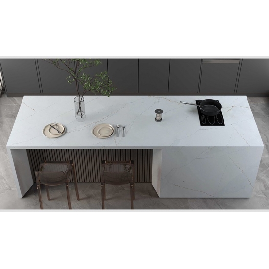 5001 Quarzo Etereo Calacatta Presenta un aspetto raffinato ed elegante, con la sua morbida base bianca delicatamente venata in tenui toni di grigio e oro. La superficie irradia raffinatezza, mentre le delicate venature creano un naturale senso di fluidità e movimento attraverso la lastra. Questo quarzo è progettato per conferire una bellezza senza tempo e un lusso discreto, esaltando l'atmosfera di qualsiasi spazio che adorna.