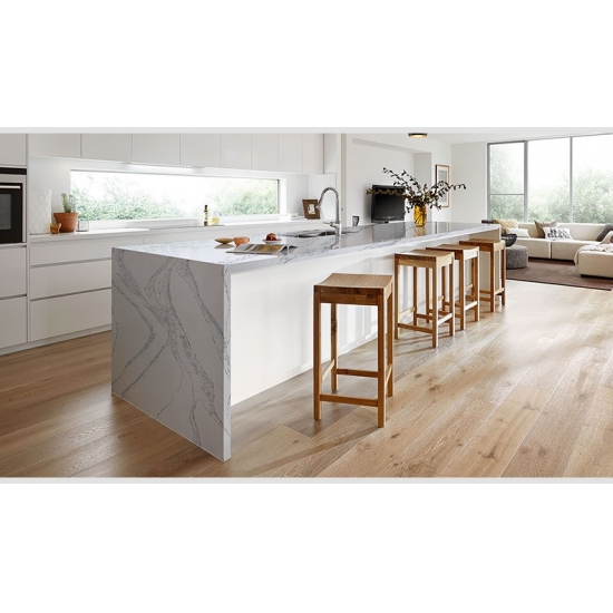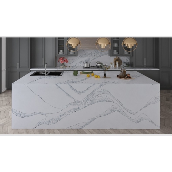 La lastra di quarzo Brittanicca 5004 presenta un carattere audace e dinamico, definito da uno sfondo color carbone intenso, attraversato da venature bianche intense e luminose. Il movimento ad alto contrasto crea un impatto visivo sorprendente e un potente senso di profondità. Questa lastra offre un'affermazione moderna e spettacolare, ideale per creare punti focali negli interni contemporanei e aggiungere un tocco di lusso accattivante a qualsiasi design.