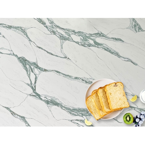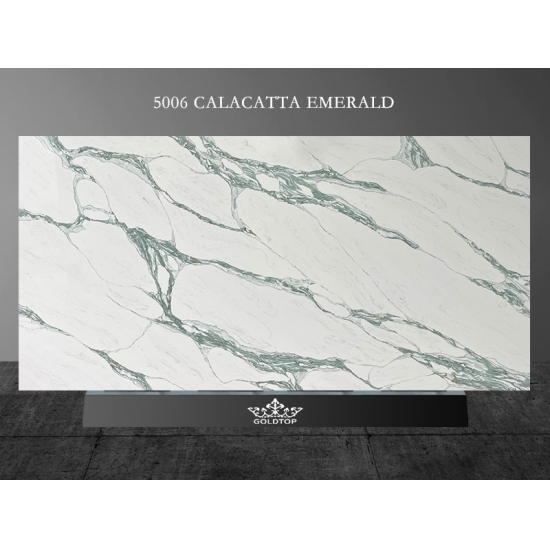 Quarzo Calacatta Grigio. La serie Calacatta è attualmente il quarzo più popolare. Questo quarzo offre l'aspetto naturale del marmo Calacatta, ma senza nessuno degli svantaggi dei piani di lavoro in marmo. Il quarzo Calacatta è un piano di lavoro molto resistente, antimacchia e antigraffio, il che lo rende anche una scelta molto pratica per piani di lavoro per cucine e bagni, scale, davanzali, mobili su misura, applicazioni per pareti e pavimenti interni ed esterni, decorazioni a getto d'acqua e altri progetti di design.