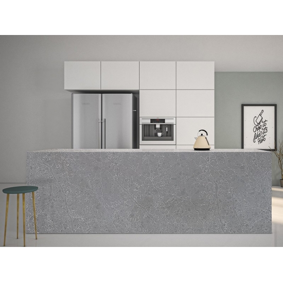 5128 Fior Bosco Quartz presenta una sofisticata tela grigia, elegantemente tratteggiata da delicate venature organiche che evocano la serena bellezza di un paesaggio boschivo. Ogni lastra presenta una composizione unica di profondità tonale e movimento fluido, conferendo un'atmosfera moderna e tranquilla a qualsiasi interno. La sua superficie luminosa esalta la riflessione della luce, creando un flusso visivo dinamico, perfetto per piani di lavoro da cucina, mobili da bagno e pareti decorative.