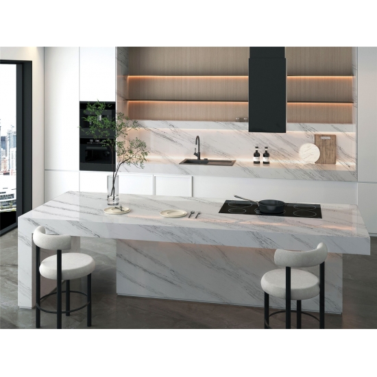 Il quarzo della serie Calacatta è attualmente il prodotto in quarzo più popolare. Raffinato e unico, il quarzo Calacatta stupisce i sensi con i suoi bianchi puri e le sue suggestive venature effetto marmo in tutta la massa. Con la sua splendida e ampia venatura e la sensazione di lusso, questo quarzo offre l'aspetto naturale del marmo Calacatta, ma senza nessuno degli svantaggi dei piani di lavoro in marmo. Il quarzo Calacatta è un piano di lavoro molto resistente, antimacchia e antigraffio, il che lo rende anche una scelta molto pratica per piani di lavoro di cucine e bagni, scale, davanzali, mobili su misura, applicazioni per pareti e pavimenti interni ed esterni, decorazioni con getto d'acqua e altri progetti di design.