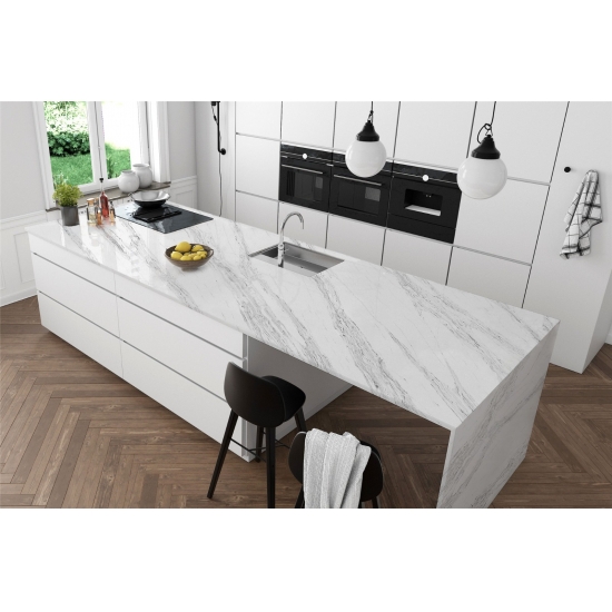 Squisito e unico, il quarzo Calacatta incanta i sensi con i suoi bianchi puri e le sue suggestive venature effetto marmo in tutta la massa. Con la sua splendida e suggestiva venatura larga e la sensazione di lusso, questo quarzo offre l'aspetto naturale del marmo Calacatta, ma senza nessuno degli svantaggi dei piani di lavoro in marmo. Il quarzo Calacatta è un piano di lavoro molto resistente, antimacchia e antigraffio, il che lo rende anche una scelta molto pratica per piani di lavoro per cucine e bagni, scale, davanzali, mobili su misura, applicazioni per pareti e pavimenti interni ed esterni, decorazioni con getto d'acqua e altri progetti di design.