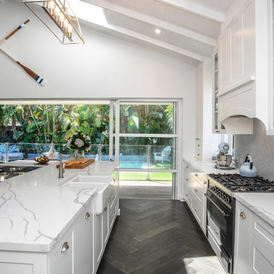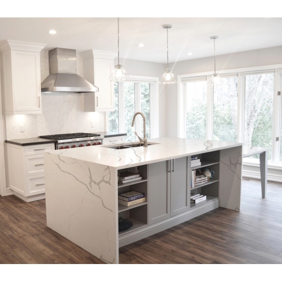 Il quarzo della serie Calacatta è attualmente il prodotto in quarzo più popolare. Raffinato e unico, il quarzo Calacatta stupisce i sensi con i suoi bianchi puri e le sue suggestive venature effetto marmo in tutta la massa. Con la sua splendida e ampia venatura e la sensazione di lusso, questo quarzo offre l'aspetto naturale del marmo Calacatta, ma senza nessuno degli svantaggi dei piani di lavoro in marmo. Il quarzo Calacatta è un piano di lavoro molto resistente, antimacchia e antigraffio, il che lo rende anche una scelta molto pratica per piani di lavoro per cucine e bagni, scale, davanzali, mobili su misura, applicazioni per pareti e pavimenti interni ed esterni, decorazioni con getto d'acqua e altri progetti di design.