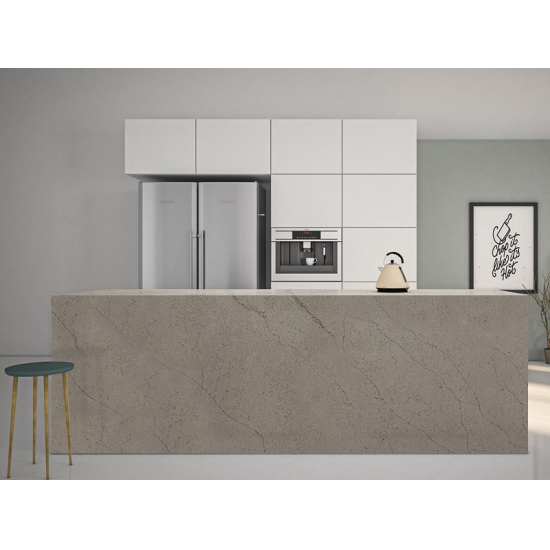 5128 Fior Bosco Quartz presenta una sofisticata tela grigia, elegantemente tratteggiata da delicate venature organiche che evocano la serena bellezza di un paesaggio boschivo. Ogni lastra presenta una composizione unica di profondità tonale e movimento fluido, conferendo un'atmosfera moderna e tranquilla a qualsiasi interno. La sua superficie luminosa esalta la riflessione della luce, creando un flusso visivo dinamico, perfetto per piani di lavoro da cucina, mobili da bagno e pareti decorative.