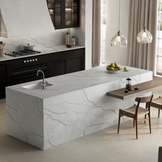 Il quarzo della serie Calacatta è attualmente il prodotto in quarzo più popolare. Raffinato e unico, il quarzo Calacatta stupisce i sensi con i suoi bianchi puri e le sue suggestive venature effetto marmo in tutta la massa. Con la sua splendida e ampia venatura e la sensazione di lusso, questo quarzo offre l'aspetto naturale del marmo Calacatta, ma senza nessuno degli svantaggi dei piani di lavoro in marmo. Il quarzo Calacatta è un piano di lavoro molto resistente, antimacchia e antigraffio, il che lo rende anche una scelta molto pratica per piani di lavoro per cucine e bagni, scale, davanzali, mobili su misura, applicazioni per pareti e pavimenti interni ed esterni, decorazioni con getto d'acqua e altri progetti di design.