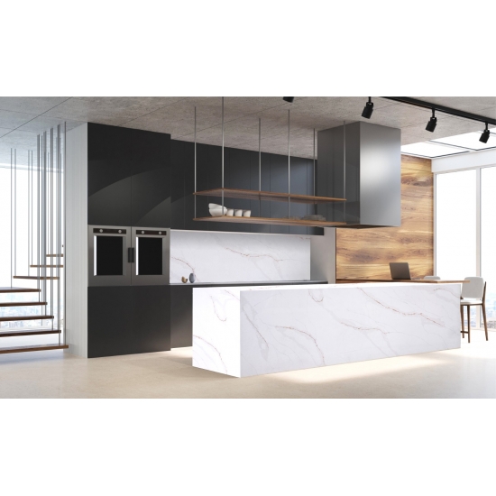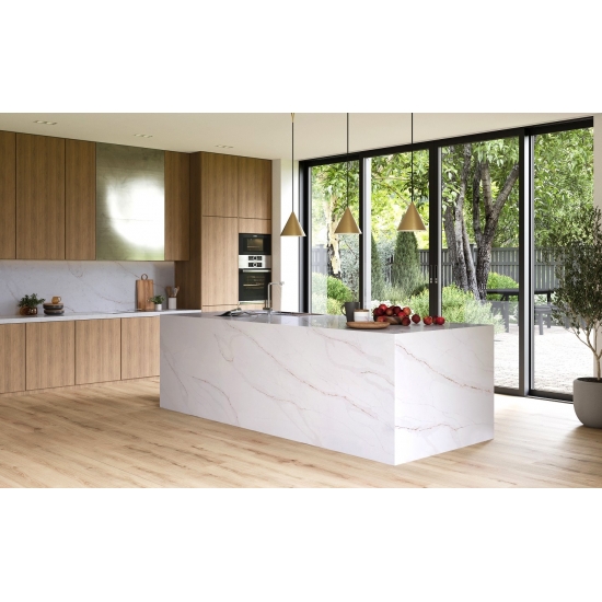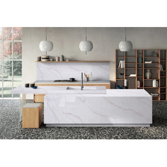 Il quarzo della serie Calacatta è attualmente il prodotto in quarzo più popolare. Raffinato e unico, il quarzo Calacatta stupisce i sensi con i suoi bianchi puri e le sue suggestive venature effetto marmo in tutta la massa. Con la sua splendida e ampia venatura e la sensazione di lusso, questo quarzo offre l'aspetto naturale del marmo Calacatta, ma senza nessuno degli svantaggi dei piani di lavoro in marmo. Il quarzo Calacatta è un piano di lavoro molto resistente, antimacchia e antigraffio, il che lo rende anche una scelta molto pratica per piani di lavoro di cucine e bagni, scale, davanzali, mobili su misura, applicazioni per pareti e pavimenti interni ed esterni, decorazioni con getto d'acqua e altri progetti di design.