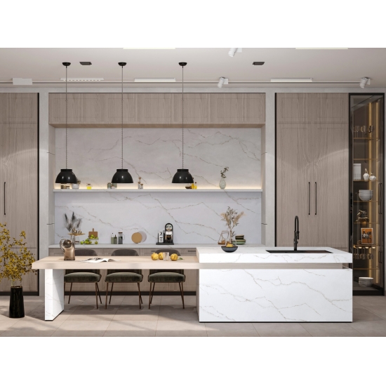 La lastra di quarzo 5061 Wave Brown presenta una base marrone caldo, elegantemente decorata da venature fluide e ondulate nei toni del crema e del tortora. Questo movimento dinamico crea un senso di sofisticatezza organica. La lastra offre una versatilità senza tempo, donando calore naturale e lusso moderno a qualsiasi spazio interno.
