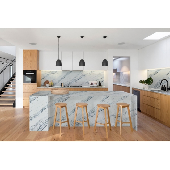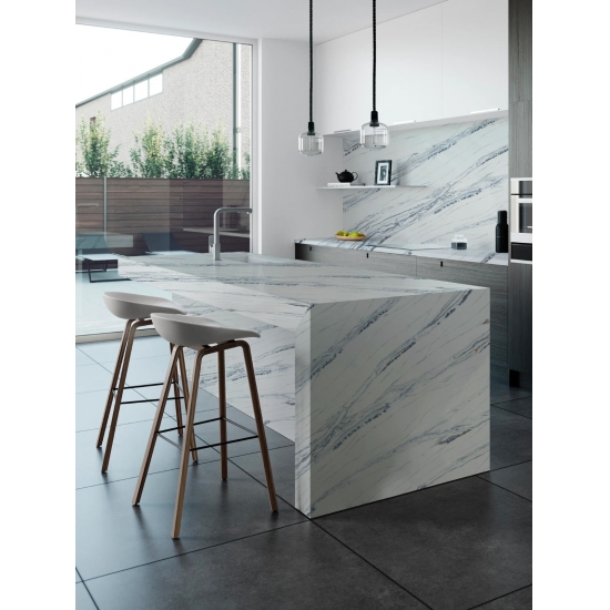 Squisito e unico, il quarzo Calacatta incanta i sensi con i suoi bianchi puri e le sue suggestive venature effetto marmo in tutta la massa. Con la sua splendida e suggestiva venatura larga e la sensazione di lusso, questo quarzo offre l'aspetto naturale del marmo Calacatta, ma senza nessuno degli svantaggi dei piani di lavoro in marmo. Il quarzo Calacatta è un piano di lavoro molto resistente, antimacchia e antigraffio, il che lo rende anche una scelta molto pratica per piani di lavoro per cucine e bagni, scale, davanzali, mobili su misura, applicazioni per pareti e pavimenti interni ed esterni, decorazioni con getto d'acqua e altri progetti di design.