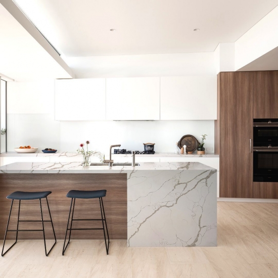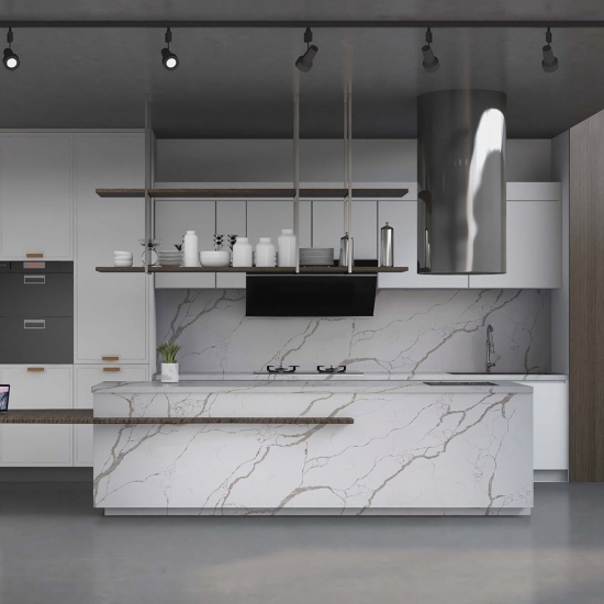 Il quarzo della serie Calacatta è attualmente il prodotto in quarzo più popolare. Raffinato e unico, il quarzo Calacatta stupisce i sensi con i suoi bianchi puri e le sue suggestive venature effetto marmo in tutta la massa. Con la sua splendida e ampia venatura e la sensazione di lusso, questo quarzo offre l'aspetto naturale del marmo Calacatta, ma senza nessuno degli svantaggi dei piani di lavoro in marmo. Il quarzo Calacatta è un piano di lavoro molto resistente, antimacchia e antigraffio, il che lo rende anche una scelta molto pratica per piani di lavoro per cucine e bagni, scale, davanzali, mobili su misura, applicazioni per pareti e pavimenti interni ed esterni, decorazioni con getto d'acqua e altri progetti di design.