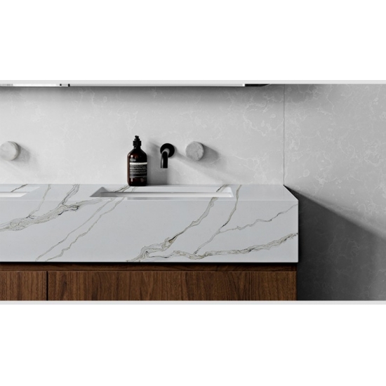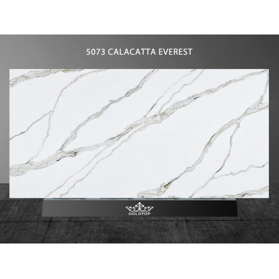 La lastra di quarzo Calacatta Everest 5073 presenta una sorprendente tela bianca, venata da intense pennellate grigie. Questo potente contrasto crea un impatto visivo dinamico e lussuoso. La lastra incarna un'eleganza maestosa, perfetta per creare un tocco sofisticato in qualsiasi interno contemporaneo.