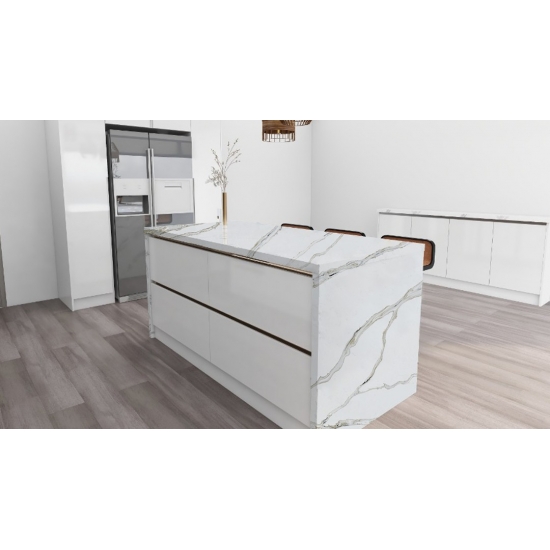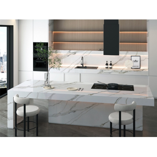 Il quarzo della serie Calacatta è attualmente il prodotto in quarzo più popolare. Raffinato e unico, il quarzo Calacatta stupisce i sensi con i suoi bianchi puri e le sue suggestive venature effetto marmo in tutta la massa. Con la sua splendida e ampia venatura e la sensazione di lusso, questo quarzo offre l'aspetto naturale del marmo Calacatta, ma senza nessuno degli svantaggi dei piani di lavoro in marmo. Il quarzo Calacatta è un piano di lavoro molto resistente, antimacchia e antigraffio, il che lo rende anche una scelta molto pratica per piani di lavoro per cucine e bagni, scale, davanzali, mobili su misura, applicazioni per pareti e pavimenti interni ed esterni, decorazioni con getto d'acqua e altri progetti di design.