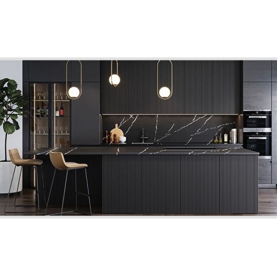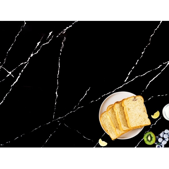 5074 Black Artwork presenta una tela nera audace, esaltata da suggestive venature bianche. Il motivo ad alto contrasto crea un impatto visivo dinamico e artistico. Questa lastra di quarzo offre un lusso moderno e si inserisce con forza in qualsiasi interno contemporaneo.