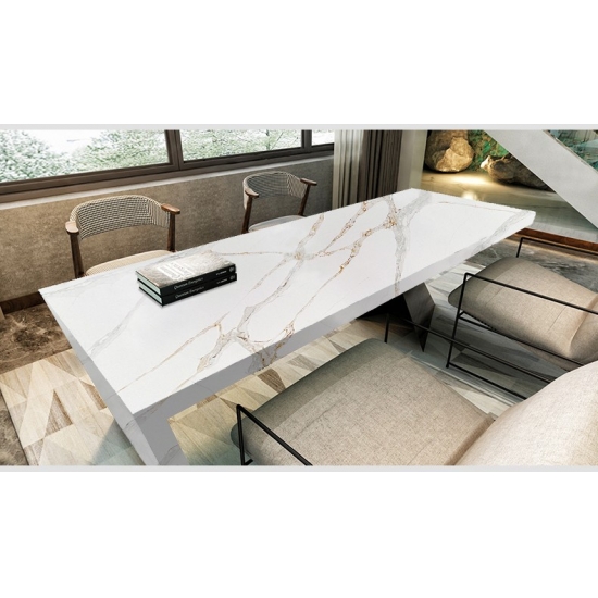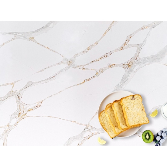 La lastra di quarzo Calacatta Primo 5075 presenta una sorprendente tela bianca impreziosita da venature audaci e spettacolari nelle tonalità del grigio. Il vivido contrasto crea un impatto visivo potente e lussuoso. Questa lastra incarna l'opulenza moderna, rendendola un elemento d'arredo ideale per cucine e bagni contemporanei, valorizzando immediatamente lo spazio con la sua decisa eleganza.