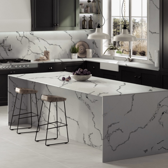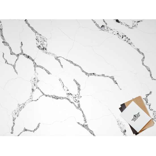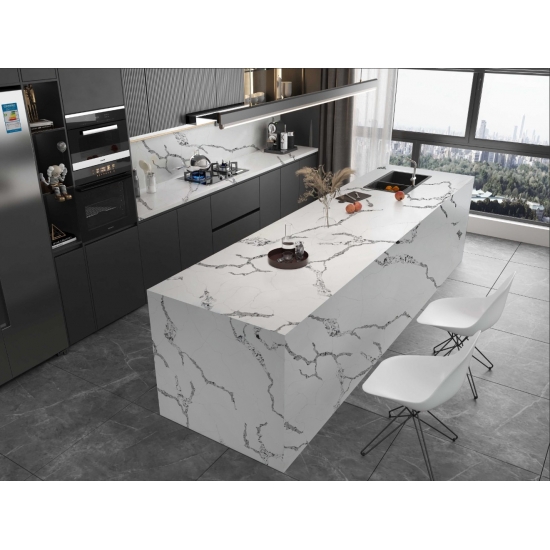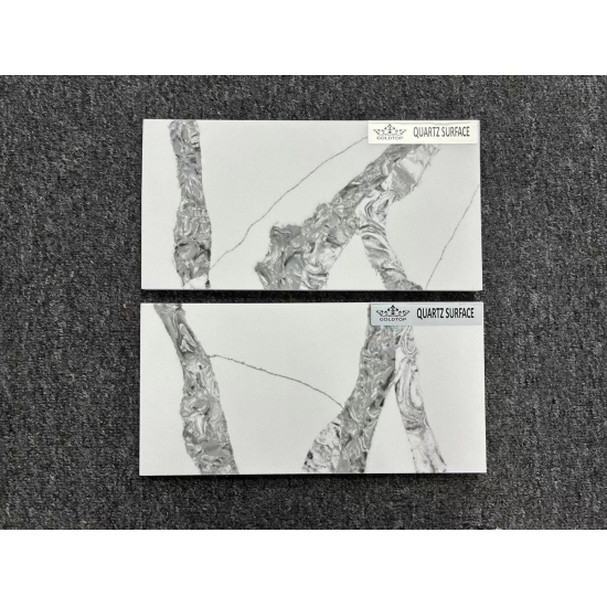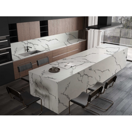 Il quarzo della serie Calacatta è attualmente il prodotto in quarzo più popolare. Raffinato e unico, il quarzo Calacatta stupisce i sensi con i suoi bianchi puri e le sue suggestive venature effetto marmo in tutta la massa. Con la sua splendida e ampia venatura e la sensazione di lusso, questo quarzo offre l'aspetto naturale del marmo Calacatta, ma senza nessuno degli svantaggi dei piani di lavoro in marmo. Il quarzo Calacatta è un piano di lavoro molto resistente, antimacchia e antigraffio, il che lo rende anche una scelta molto pratica per piani di lavoro per cucine e bagni, scale, davanzali, mobili su misura, applicazioni per pareti e pavimenti interni ed esterni, decorazioni con getto d'acqua e altri progetti di design.