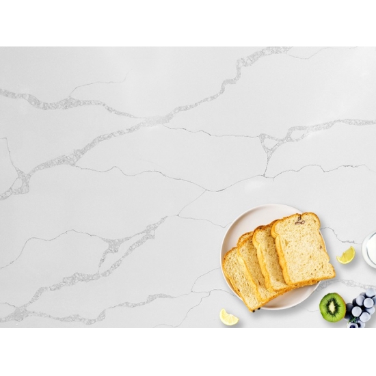 La lastra di quarzo Calacatta Trento 5088 presenta una superficie bianca brillante impreziosita da suggestive e audaci venature grigie. Il contrasto drammatico crea un potente senso di profondità e movimento dinamico. Questa lastra incarna una lussuosa grandiosità, perfetta per conferire un tocco sofisticato a qualsiasi interno, dal moderno ai classici più opulenti.