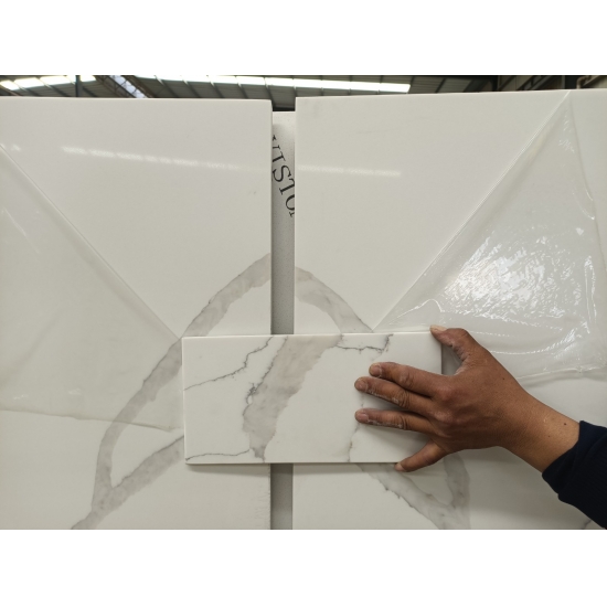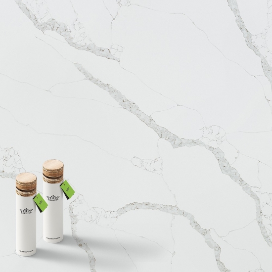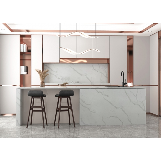 Il quarzo della serie Calacatta è attualmente il prodotto in quarzo più popolare. Raffinato e unico, il quarzo Calacatta stupisce i sensi con i suoi bianchi puri e le sue suggestive venature effetto marmo in tutta la massa. Con la sua splendida e ampia venatura e la sensazione di lusso, questo quarzo offre l'aspetto naturale del marmo Calacatta, ma senza nessuno degli svantaggi dei piani di lavoro in marmo. Il quarzo Calacatta è un piano di lavoro molto resistente, antimacchia e antigraffio, il che lo rende anche una scelta molto pratica per piani di lavoro di cucine e bagni, scale, davanzali, mobili su misura, applicazioni per pareti e pavimenti interni ed esterni, decorazioni con getto d'acqua e altri progetti di design.