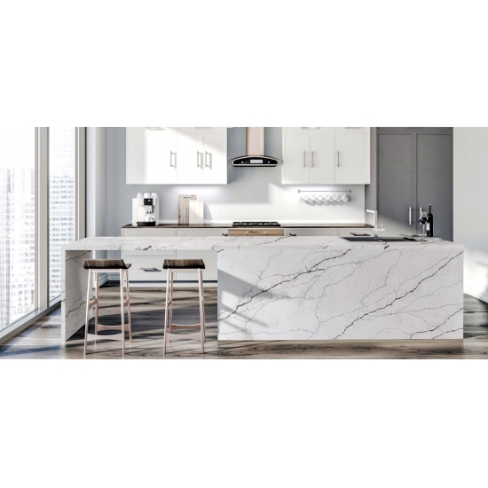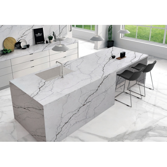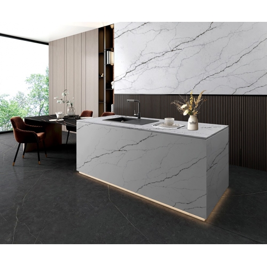 Il quarzo della serie Calacatta è attualmente il prodotto in quarzo più popolare. Raffinato e unico, il quarzo Calacatta stupisce i sensi con i suoi bianchi puri e le sue suggestive venature effetto marmo in tutta la massa. Con la sua splendida e ampia venatura e la sensazione di lusso, questo quarzo offre l'aspetto naturale del marmo Calacatta, ma senza nessuno degli svantaggi dei piani di lavoro in marmo. Il quarzo Calacatta è un piano di lavoro molto resistente, antimacchia e antigraffio, il che lo rende anche una scelta molto pratica per piani di lavoro di cucine e bagni, scale, davanzali, mobili su misura, applicazioni per pareti e pavimenti interni ed esterni, decorazioni con getto d'acqua e altri progetti di design.