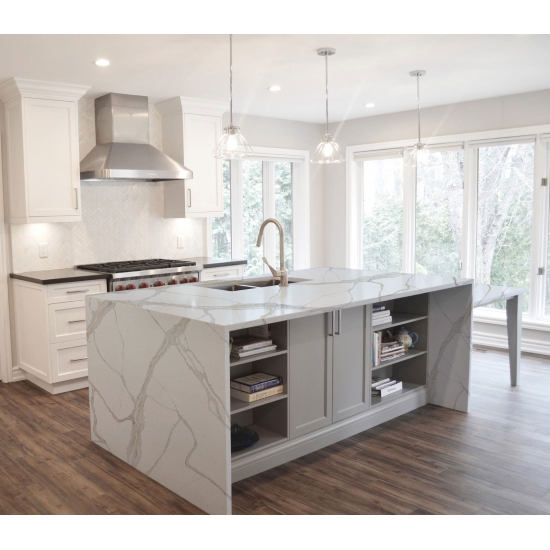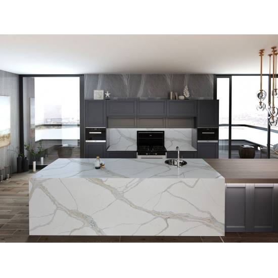 Il quarzo della serie Calacatta è attualmente il prodotto in quarzo più popolare. Raffinato e unico, il quarzo Calacatta stupisce i sensi con i suoi bianchi puri e le sue suggestive venature effetto marmo in tutta la massa. Con la sua splendida e ampia venatura e la sensazione di lusso, questo quarzo offre l'aspetto naturale del marmo Calacatta, ma senza nessuno degli svantaggi dei piani di lavoro in marmo. Il quarzo Calacatta è un piano di lavoro molto resistente, antimacchia e antigraffio, il che lo rende anche una scelta molto pratica per piani di lavoro di cucine e bagni, scale, davanzali, mobili su misura, applicazioni per pareti e pavimenti interni ed esterni, decorazioni con getto d'acqua e altri progetti di design.