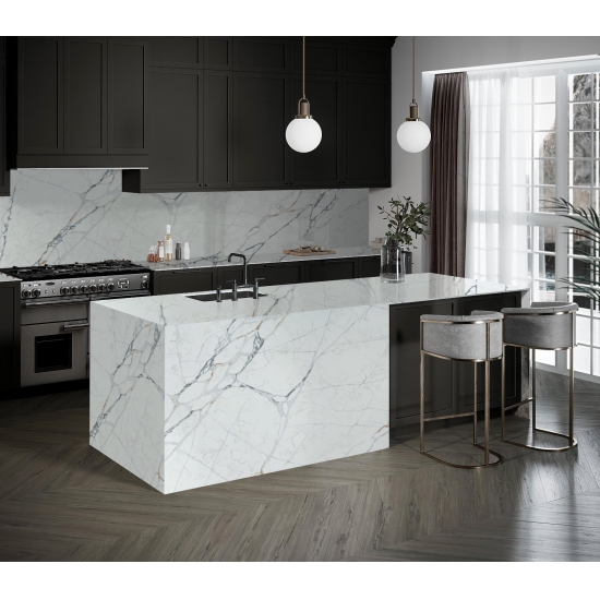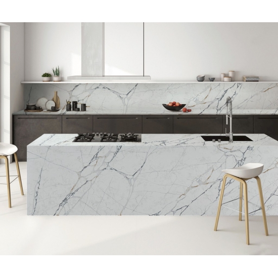 Squisito e unico, il quarzo Calacatta incanta i sensi con i suoi bianchi puri e le sue suggestive venature effetto marmo in tutta la massa. Con la sua splendida e suggestiva venatura larga e la sensazione di lusso, questo quarzo offre l'aspetto naturale del marmo Calacatta, ma senza nessuno degli svantaggi dei piani di lavoro in marmo. Il quarzo Calacatta è un piano di lavoro molto resistente, antimacchia e antigraffio, il che lo rende anche una scelta molto pratica per piani di lavoro per cucine e bagni, scale, davanzali, mobili su misura, applicazioni per pareti e pavimenti interni ed esterni, decorazioni con getto d'acqua e altri progetti di design.