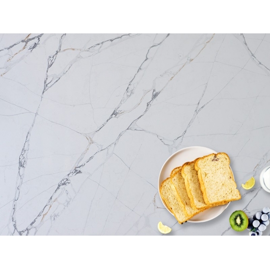 Squisito e unico, il quarzo Calacatta incanta i sensi con i suoi bianchi puri e le sue suggestive venature effetto marmo in tutta la massa. Con la sua splendida e suggestiva venatura larga e la sensazione di lusso, questo quarzo offre l'aspetto naturale del marmo Calacatta, ma senza nessuno degli svantaggi dei piani di lavoro in marmo. Il quarzo Calacatta è un piano di lavoro molto resistente, antimacchia e antigraffio, il che lo rende anche una scelta molto pratica per piani di lavoro per cucine e bagni, scale, davanzali, mobili su misura, applicazioni per pareti e pavimenti interni ed esterni, decorazioni con getto d'acqua e altri progetti di design.