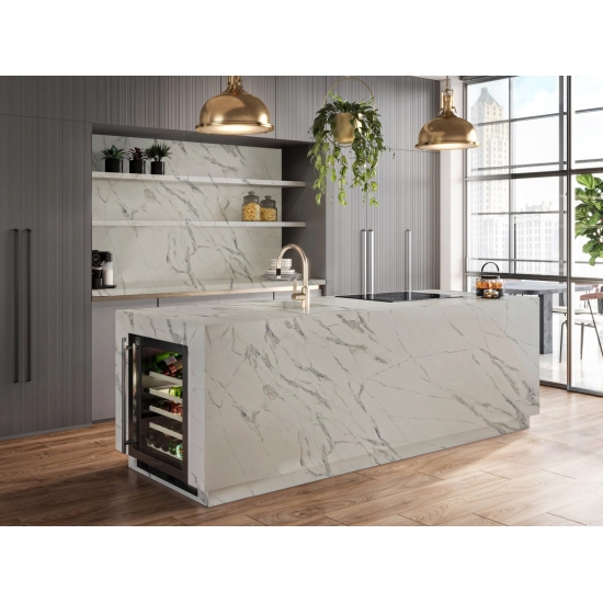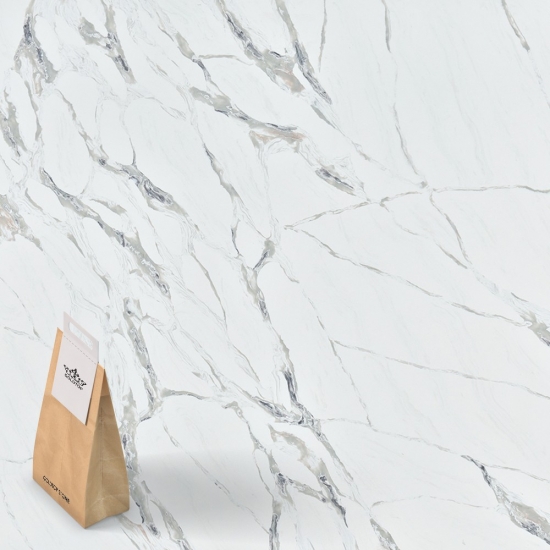 Il quarzo della serie Calacatta è attualmente il prodotto in quarzo più popolare. Raffinato e unico, il quarzo Calacatta stupisce i sensi con i suoi bianchi puri e le sue suggestive venature effetto marmo in tutta la massa. Con la sua splendida e ampia venatura e la sensazione di lusso, questo quarzo offre l'aspetto naturale del marmo Calacatta, ma senza nessuno degli svantaggi dei piani di lavoro in marmo. Il quarzo Calacatta è un piano di lavoro molto resistente, antimacchia e antigraffio, il che lo rende anche una scelta molto pratica per piani di lavoro di cucine e bagni, scale, davanzali, mobili su misura, applicazioni per pareti e pavimenti interni ed esterni, decorazioni con getto d'acqua e altri progetti di design.