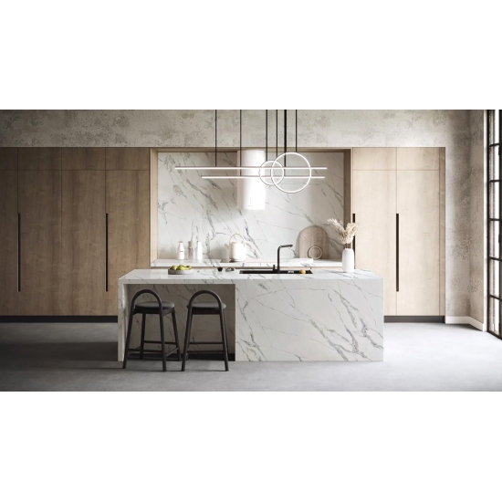 Squisito e unico, il quarzo Calacatta incanta i sensi con i suoi bianchi puri e le sue suggestive venature effetto marmo in tutta la massa. Con la sua splendida e suggestiva venatura larga e la sensazione di lusso, questo quarzo offre l'aspetto naturale del marmo Calacatta, ma senza nessuno degli svantaggi dei piani di lavoro in marmo. Il quarzo Calacatta è un piano di lavoro molto resistente, antimacchia e antigraffio, il che lo rende anche una scelta molto pratica per piani di lavoro per cucine e bagni, scale, davanzali, mobili su misura, applicazioni per pareti e pavimenti interni ed esterni, decorazioni con getto d'acqua e altri progetti di design.