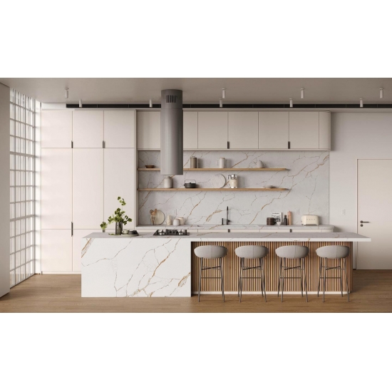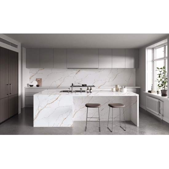 Squisito e unico, il quarzo Calacatta incanta i sensi con i suoi bianchi puri e le sue suggestive venature effetto marmo in tutta la massa. Con la sua splendida e suggestiva venatura larga e la sensazione di lusso, questo quarzo offre l'aspetto naturale del marmo Calacatta, ma senza nessuno degli svantaggi dei piani di lavoro in marmo. Il quarzo Calacatta è un piano di lavoro molto resistente, antimacchia e antigraffio, il che lo rende anche una scelta molto pratica per piani di lavoro per cucine e bagni, scale, davanzali, mobili su misura, applicazioni per pareti e pavimenti interni ed esterni, decorazioni con getto d'acqua e altri progetti di design.