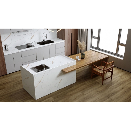 Il quarzo della serie Calacatta è attualmente il prodotto in quarzo più popolare. Raffinato e unico, il quarzo Calacatta stupisce i sensi con i suoi bianchi puri e le sue suggestive venature effetto marmo in tutta la massa. Con la sua splendida e ampia venatura e la sensazione di lusso, questo quarzo offre l'aspetto naturale del marmo Calacatta, ma senza nessuno degli svantaggi dei piani di lavoro in marmo. Il quarzo Calacatta è un piano di lavoro molto resistente, antimacchia e antigraffio, il che lo rende anche una scelta molto pratica per piani di lavoro di cucine e bagni, scale, davanzali, mobili su misura, applicazioni per pareti e pavimenti interni ed esterni, decorazioni con getto d'acqua e altri progetti di design.