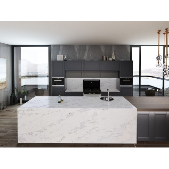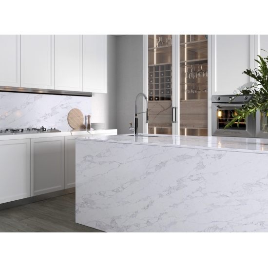 Il quarzo della serie Calacatta è attualmente il prodotto in quarzo più popolare. Raffinato e unico, il quarzo Calacatta stupisce i sensi con i suoi bianchi puri e le sue suggestive venature effetto marmo in tutta la massa. Con la sua splendida e ampia venatura e la sensazione di lusso, questo quarzo offre l'aspetto naturale del marmo Calacatta, ma senza nessuno degli svantaggi dei piani di lavoro in marmo. Il quarzo Calacatta è un piano di lavoro molto resistente, antimacchia e antigraffio, il che lo rende anche una scelta molto pratica per piani di lavoro di cucine e bagni, scale, davanzali, mobili su misura, applicazioni per pareti e pavimenti interni ed esterni, decorazioni con getto d'acqua e altri progetti di design.