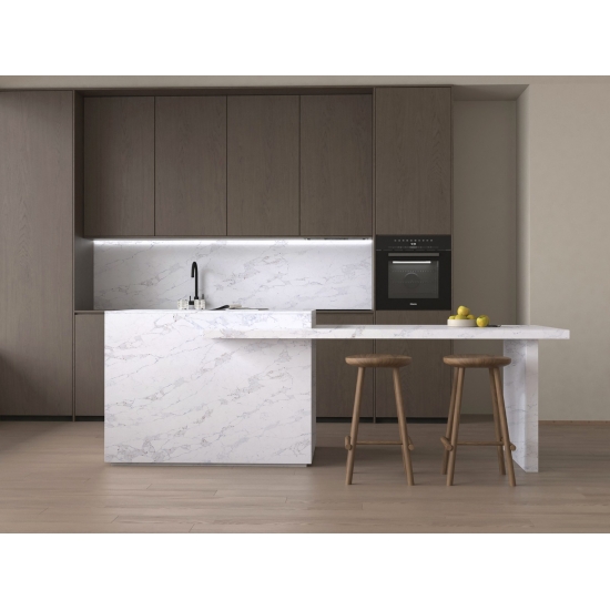 Il quarzo 5121 Milan Extra Calacatta Gold sfoggia un aspetto audace e spettacolare con il suo sfondo nero intenso intervallato da fini particelle scintillanti. La superficie trasuda raffinatezza, poiché i toni scuri sono contrastati da sottili riflessi che catturano la luce, creando un senso di profondità e movimento. Questo quarzo è progettato per distinguersi, aggiungendo un tocco di opulenza a qualsiasi spazio in cui si inserisce.