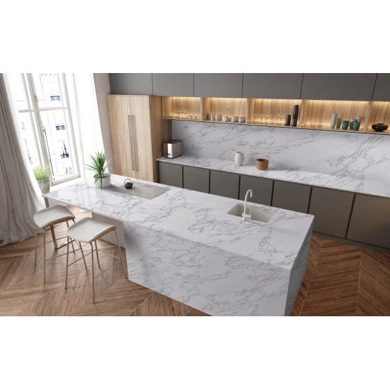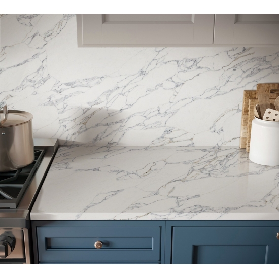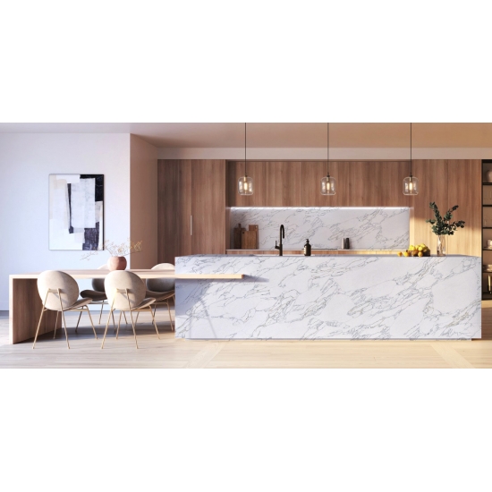 Squisito e unico, il quarzo Calacatta incanta i sensi con i suoi bianchi puri e le sue suggestive venature effetto marmo in tutta la massa. Con la sua splendida e suggestiva venatura larga e la sensazione di lusso, questo quarzo offre l'aspetto naturale del marmo Calacatta, ma senza nessuno degli svantaggi dei piani di lavoro in marmo. Il quarzo Calacatta è un piano di lavoro molto resistente, antimacchia e antigraffio, il che lo rende anche una scelta molto pratica per piani di lavoro per cucine e bagni, scale, davanzali, mobili su misura, applicazioni per pareti e pavimenti interni ed esterni, decorazioni con getto d'acqua e altri progetti di design.