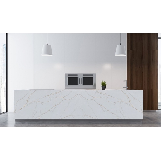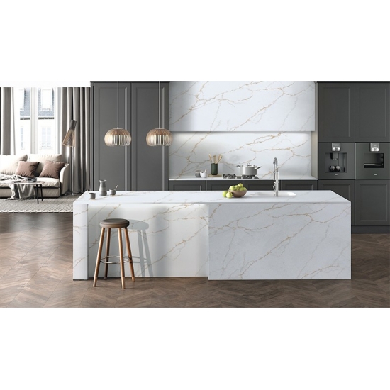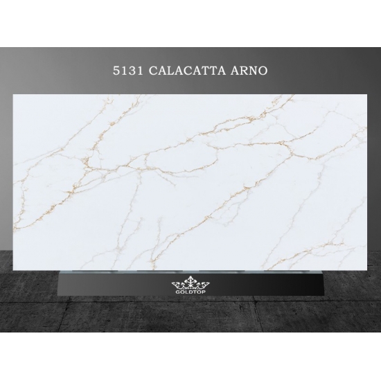 Calacatta Arno Quartz è un capolavoro di eleganza ingegneristica, che cattura l'essenza del pregiato marmo naturale. Presenta una calda e invitante tela bianca, elegantemente percorsa da delicate venature grigie, ciascuna delicatamente accentuata da sottili riflessi dorati. Questa lussuosa composizione racchiude l'intramontabile drammaticità e la sofisticata bellezza del marmo, perfetta per creare un punto focale in qualsiasi interno. Disponibile per piani di lavoro, paraschizzi e pareti decorative, porta un armonioso mix di ispirazione classica e lusso contemporaneo in cucine, bagni e non solo.