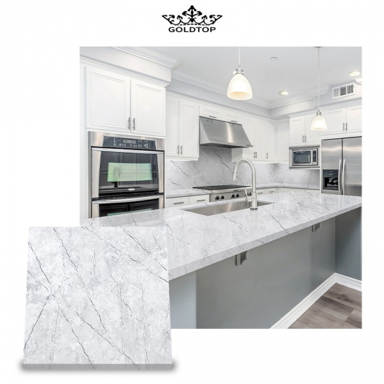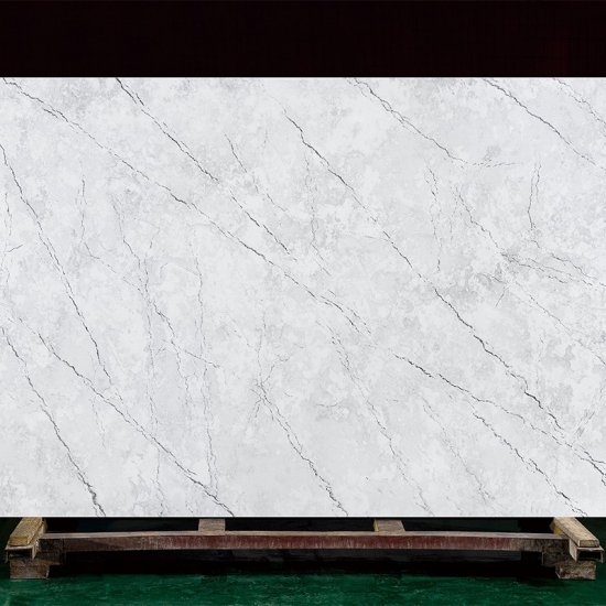 Il quarzo bianco cemento con texture a fiocco di neve è un materiale di quarzo artificiale appositamente trattato. Simile a una finitura opaca, la finitura cemento altera leggermente il colore del quarzo rispetto alla classica finitura lucida. Questa finitura è anche chiamata "spazzolata" quando si fa riferimento al granito.