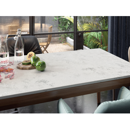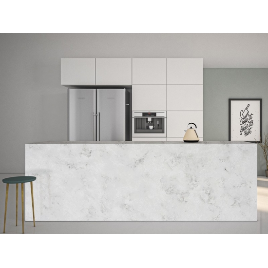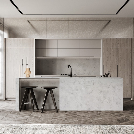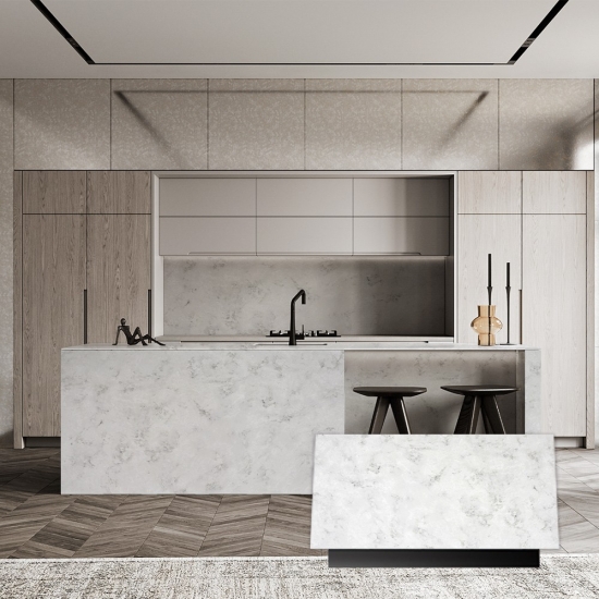 6022 Concrete Onyx è una pietra ingegnerizzata contemporanea ed elegante, nota per il suo aspetto raffinato e moderno. Presenta una base grigio chiaro con venature sottili e sofisticate in tonalità più scure, che creano un look raffinato e di ispirazione industriale. Le venature spesso ricordano le texture del cemento, aggiungendo un tocco urbano ed elegante alla sua estetica.