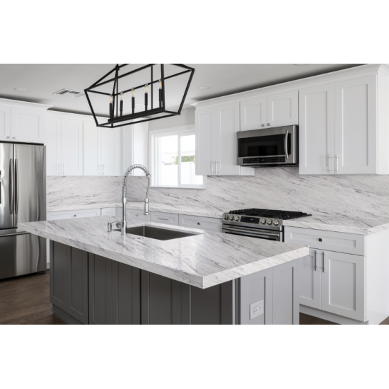Il quarzo bianco cemento con texture a fiocco di neve è un materiale di quarzo artificiale appositamente trattato. Simile a una finitura opaca, la finitura cemento altera leggermente il colore del quarzo rispetto alla classica finitura lucida. Questa finitura è anche chiamata "spazzolata" quando si fa riferimento al granito.