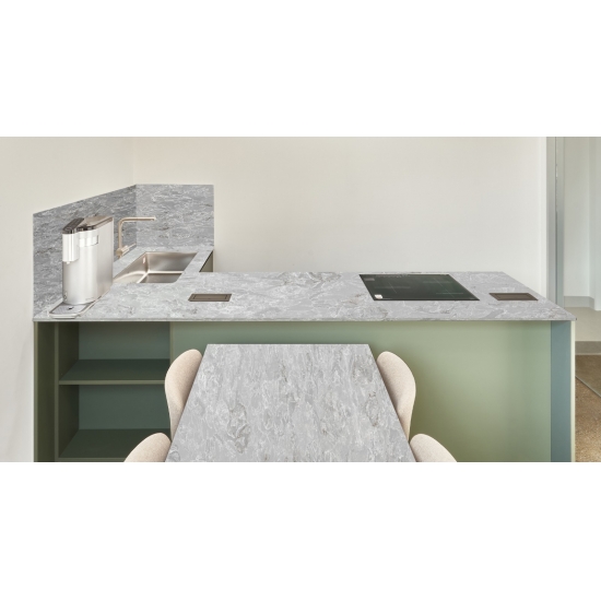 6004 Horizon Grey CEMENTO QUARZO Il quarzo cemento è un materiale di quarzo artificiale appositamente trattato. Simile a una finitura opaca, la finitura cemento altera leggermente il colore del quarzo rispetto alla classica finitura lucida. Questa finitura è anche chiamata "spazzolata" quando si fa riferimento al granito.