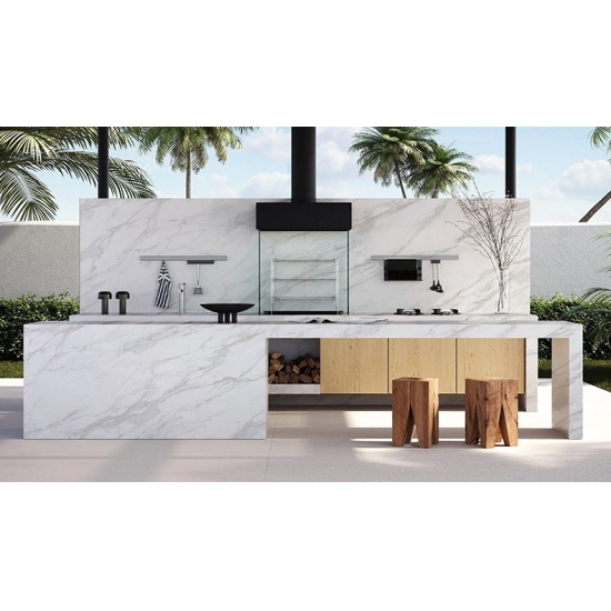 Presenta un'estetica raffinata ed elegante, con uno sfondo bianco delicato impreziosito da delicate e fluide venature grigie. Le sottili venature creano un aspetto naturale e armonioso, aggiungendo profondità senza sovrastare la superficie. Questo quarzo emana un senso di lusso discreto, bilanciando purezza e raffinatezza, ed è ideale per creare spazi luminosi e senza tempo dal carattere calmo e aggraziato.