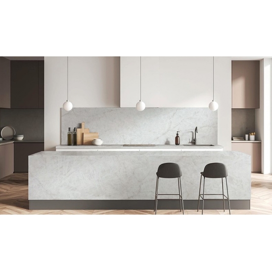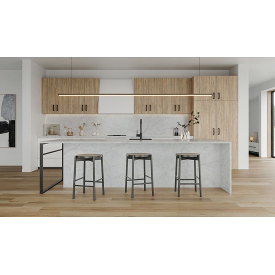 Cristallo Printed Quartz è una pietra artificiale ispirata alla rara quarzite naturale, che riproduce meticolosamente l'iconica bellezza della quarzite Cristallo. Presenta uno sfondo bianco ghiaccio luminoso impreziosito da delicate venature grigie e vivaci particelle cristalline arancioni, che creano un bagliore morbido e traslucido sotto la luce, per un'atmosfera eterea e lussuosa.