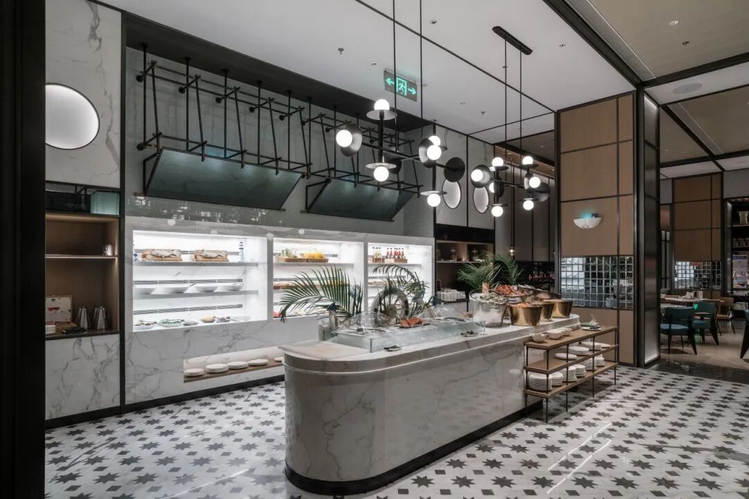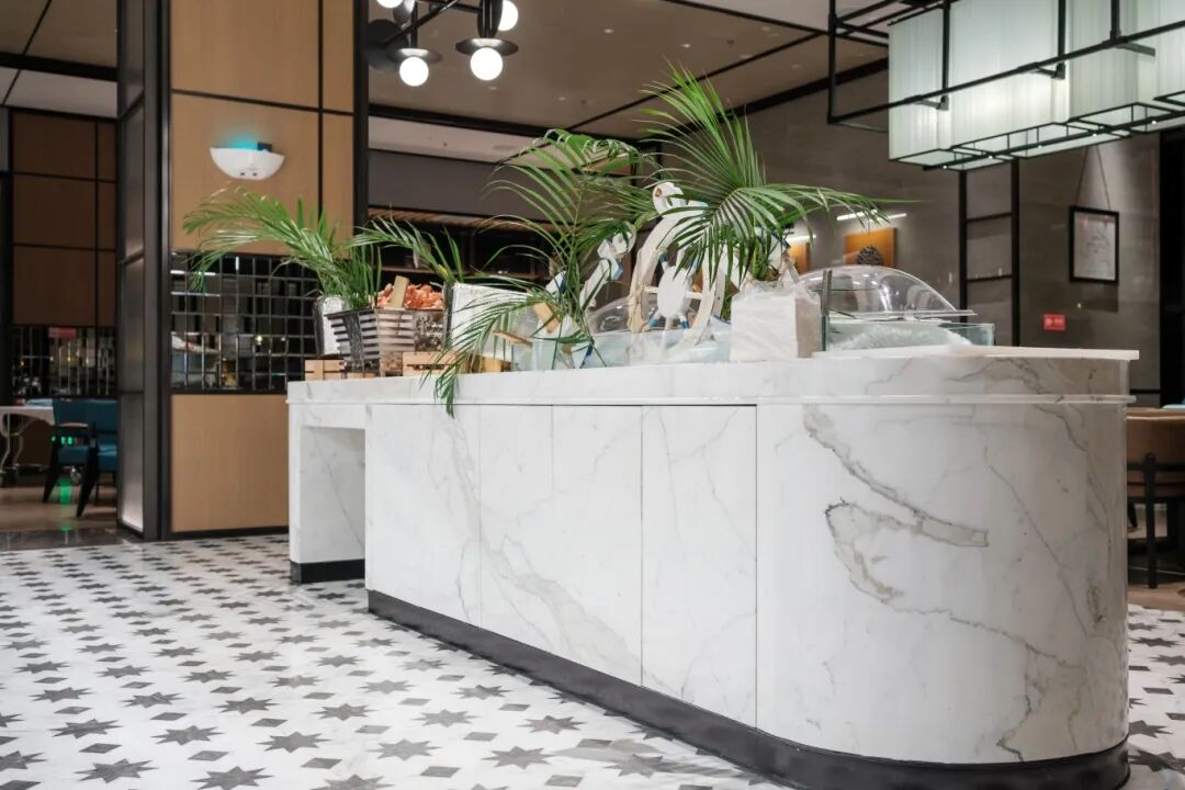 Sheraton Taiyuan, You can see the calacatta white countertops, floor and wall, the brand's first presence in the city, utilizes Calacatta White to establish its premium positioning. The marble's silky lustre and clean white surface create welcoming yet formal spaces in lobby and key areas, demonstrating how natural stone can reinforce brand identity while providing timeless elegance.