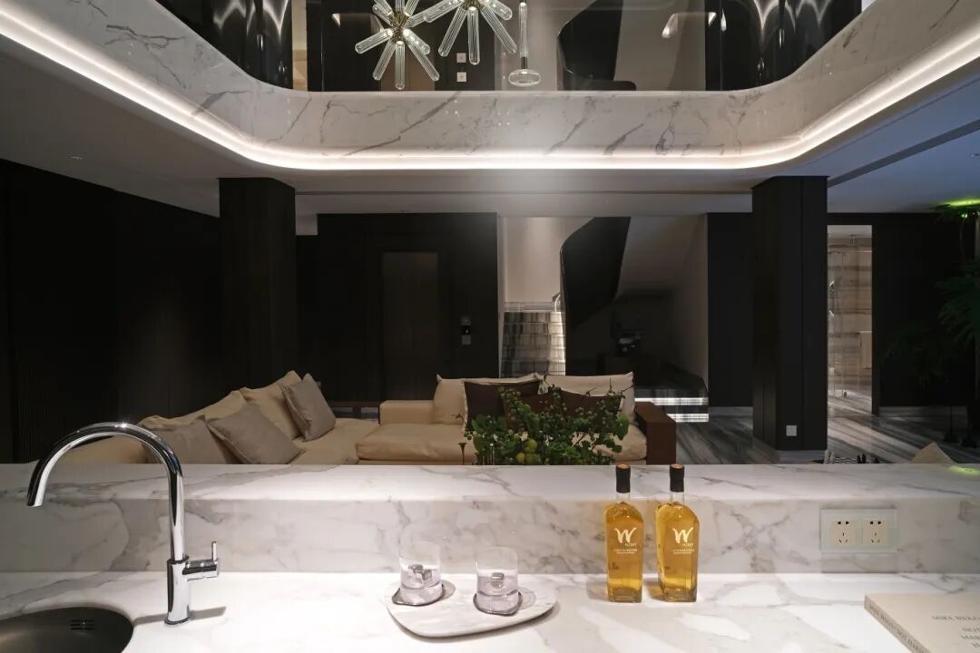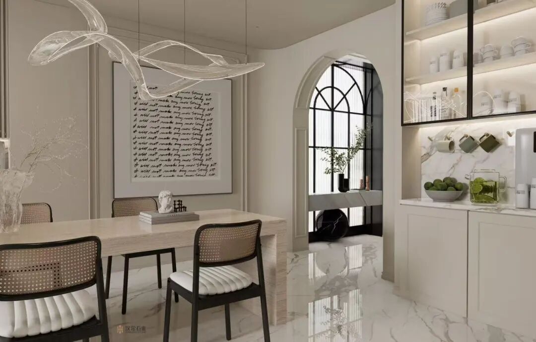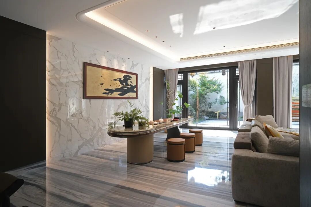 In private residences, Calacatta White reveals its more intimate character. At Hangzhou Private Residence 011, the stone serves as a serene backdrop that connects interior spaces with garden landscapes. Its warm white tones and delicate veiling create peaceful living environments that feel both luxurious and naturally grounded.